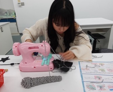 ファッション科学研究室では、今回のように特殊素材に触れ、その特性を知り、それを活かしてつくる時間をとおして、学びを深めるとともに、仲間とのつながりを育むひとときにもなればと考えています。