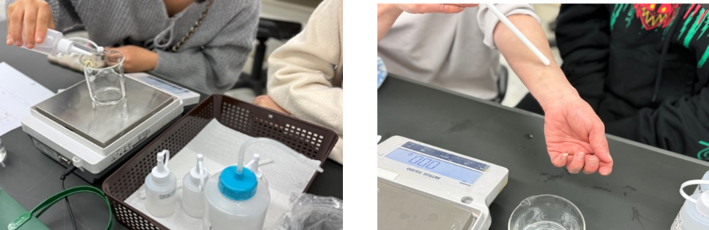 この時、化粧水に必ず配合されている保湿剤を実際に肌に塗布して感触を確認してもらいました。保湿剤は、グリセリンとBG(1, 3-ブチレングリコール)の2種類です。