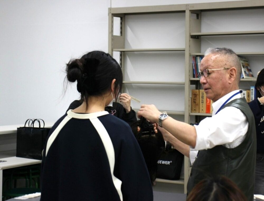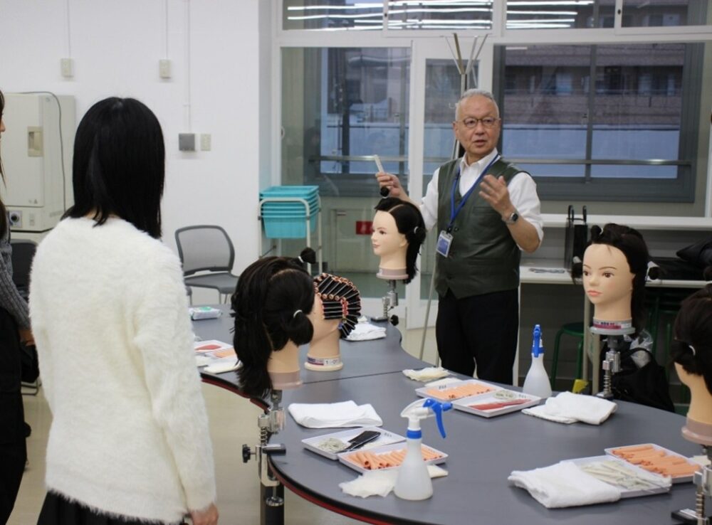 今回の体験では、実際の授業で使う道具やウィッグを使って体験をしていただきました。
