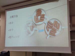 写真は、あるメーカーのウインナーソーセージを「ゆで」「焼き」「電子レンジ」調理でそれぞれ調理して比較しているものです。見た目、味、食感(特に「パリッ」とした歯ごたえ)を比べていました。