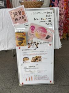 北ロビーの献血受付場所で、心理学科の学生たちと奈良県橿原市にある佐藤薬品工業株式会社が産学連携で共同で開発した製品である「フェチョコビ」を佐久田ゼミの学生たちが献血に協力してくれた学生たちへの御礼として手渡してくれました。この製品は1本で1日分の鉄分を摂取できるお菓子です。