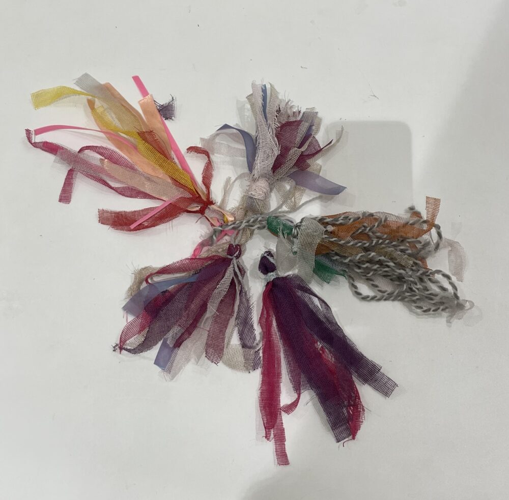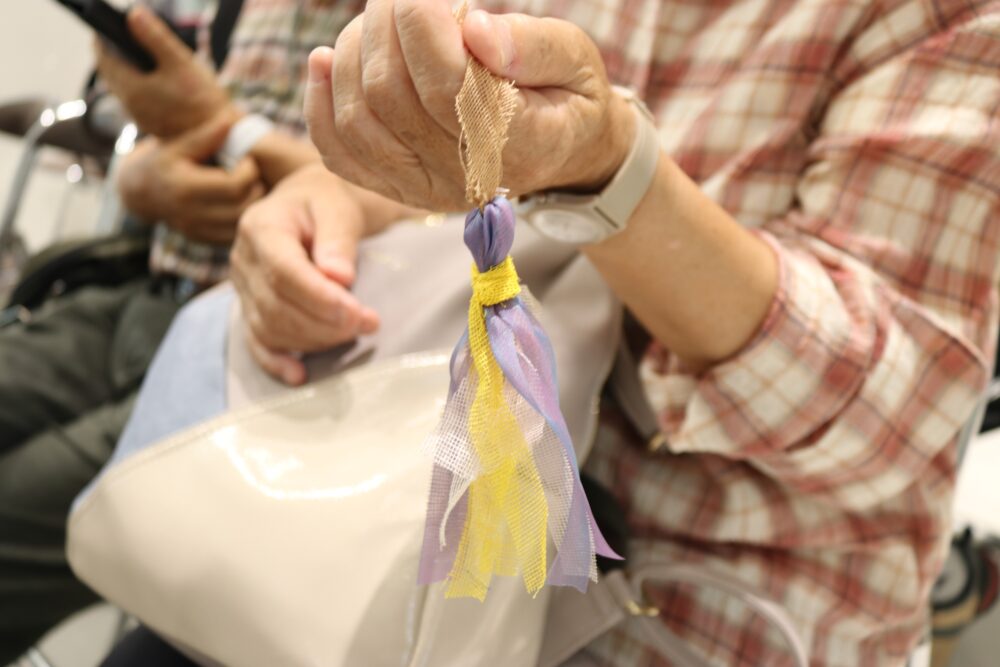 企業よりご提供いただいた繊維廃材(蚊帳※・デニム生機・カーペットの糸)を用いたタッセル作りを企画しました。大きさも色も素材もさまざまな素材を手に、自由な発想で組み合わせることで、世界に一つだけの作品に包まれました。