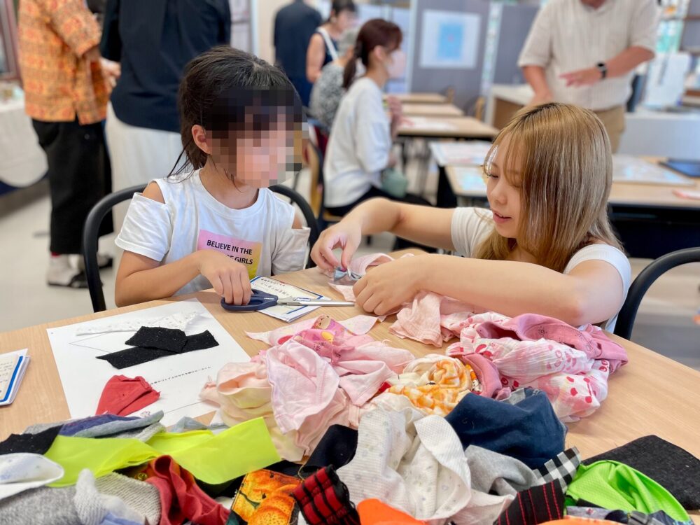 絵本に出てくる主人公のワンピースを古着やハギレでコラージュしながら、素材の違いや服以外に用いられている副資材の存在を感じていただき、衣服のリサイクル率が低い理由を考えるきっかけづくりとしました。
