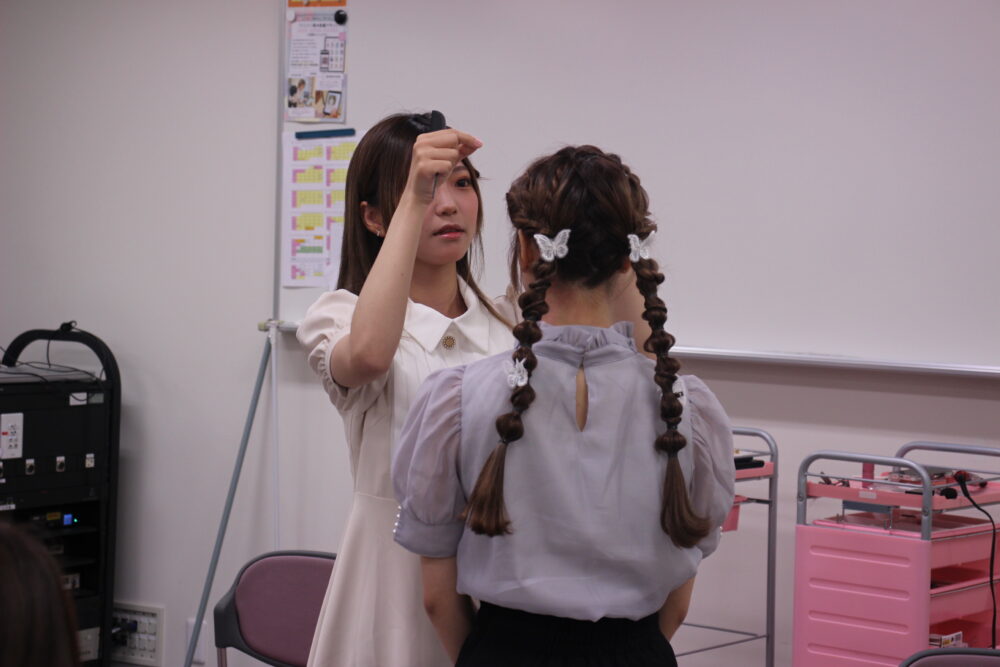 ヘア担当の学生は、モデル学生の髪質や顔や頭のかたちを踏まえ、効果的に仕上げる技や