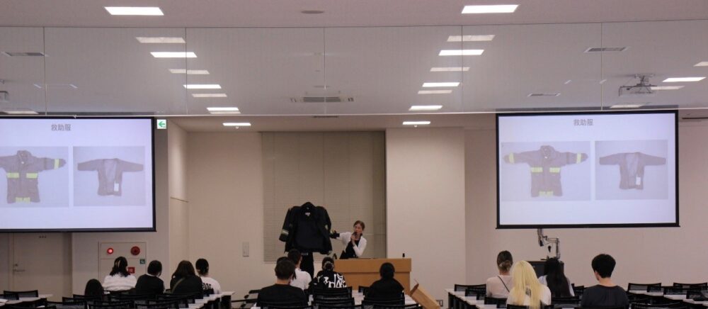 一方で、消防士が着用する防火服には、炎から身体を保護する素材(質感)や運動機能性を考慮した縫製上の工夫(かたち)、更には救助服のオレンジ色は煙中の視認性を高める工夫(色)があることなど実物を提示しながら解説しました。