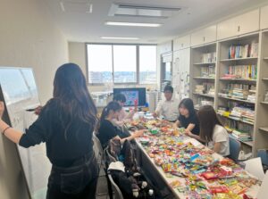 6月13日の授業では、他社製品を含めた数多くの駄菓子を集めて、学生たちがその特徴やコンセプトを理解し、実際にそれらの商品を試食することで新たな商品開発に繋がるアイデアを探るための取り組みをしました。受講している学生は心理学科、健康栄養学部、ライプランニング学科フードスタディコースの学生と様々で、それぞれの専門を生かした学生たちの努力がぜひ新たな商品の販売に繋がることを願っています。