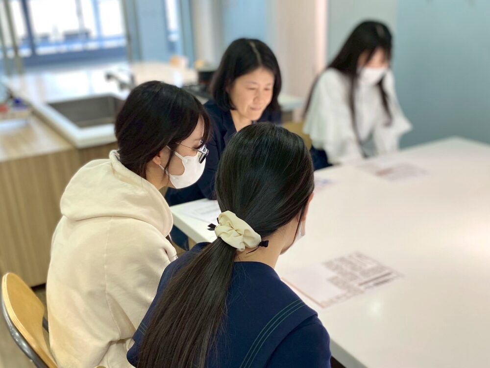 今回は野間先生(食料経済学)によるお米の経済事情の講話を聞きながら、坂根先生(調理学・ガストロノミー)による実習に、高校生とライフプランニング学科の学生が参加しました。