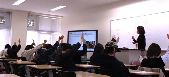 企画では、さまざまな場面(初バイトの面接、証明書写真撮影、大学の授業など)でメイクをしたほうが良いか良くないかを、参加の高校生、保護者様全員に挙手で回答していただきました。