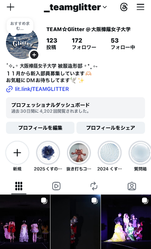 被服造形部の活動の様子は、Instagram(@_teamglitter) でご覧いただけますので、
