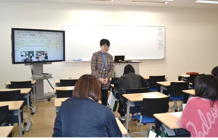 大学で学ぶ授業は、将来の資格取得や就職を見通して、履修する科目等を選んで自分で時間割をつくります。就職活動ももちろん自分で行ないます。就職活動の例として、中・高等学校家庭科の教員採用試験の紹介をしました。
